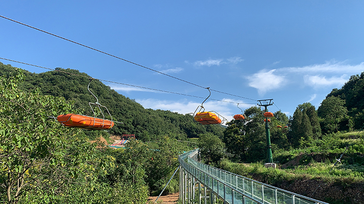 固定抱索器拖船索道主要用于漂流水滑,索道整體分布為驅(qū)動站、迂回站和線路部分,漂流船吊籃通過固定抱索器與鋼絲繩固定在一起。驅(qū)動站是為索道提供動力的部位,經(jīng)迂回站的迂回輪導(dǎo)向后,把裝載有漂流船的運輸?shù)趸@返回至上游的驅(qū)動站,達到運輸漂流船的目的,利用索道方式運輸漂流船的效率高。索道造價低,維護成本低,配置工作人員少,節(jié)約運輸成本。